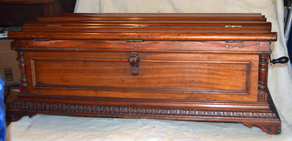 This machine playing the largest of Regina discs probably dates ca 1896-1900. It would have been sold as a Style 7, but most collectors today would refer to it as a 27" accordion case or casket case Regina. In a space saving arrangement, the lid folds out and provides support for the dishing wheels.
