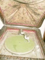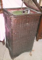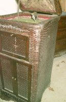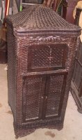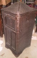 This is the wildest wicker Victrola we have ever seen -- serpentine sides and a pagoda lid. It is marked Retola, Ausonia Reed Furniture Company, New York, and could best be described as an art case or period machine rendered in wicker. Original wicker finish, some minor reweaving done mostly near the bottom. Works and plays OK.