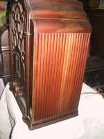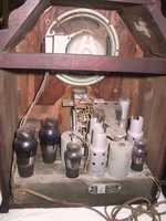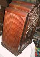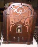 I'm not a radio dealer, but I understand that this Zenith with the round dial, made 1933-34, has become a fairly desirable radio. The case is pretty clean -- there's a slight veneer chip on the front and a little weathering on the top. The base molding was pulling out of the cabinet when we purchased this -- looks as if they were set in with nails and then the nails covered with original filler. One side of the base molding has been reglued; the other side is still pulling out. Everytime I plug in strange electrical appliances I start a fire, so please don't ask me to test this Model 715, you can assume that it is not working. Click on the thumbnails for expanded pictures. If you need more images I would be happy to shoot you another set.