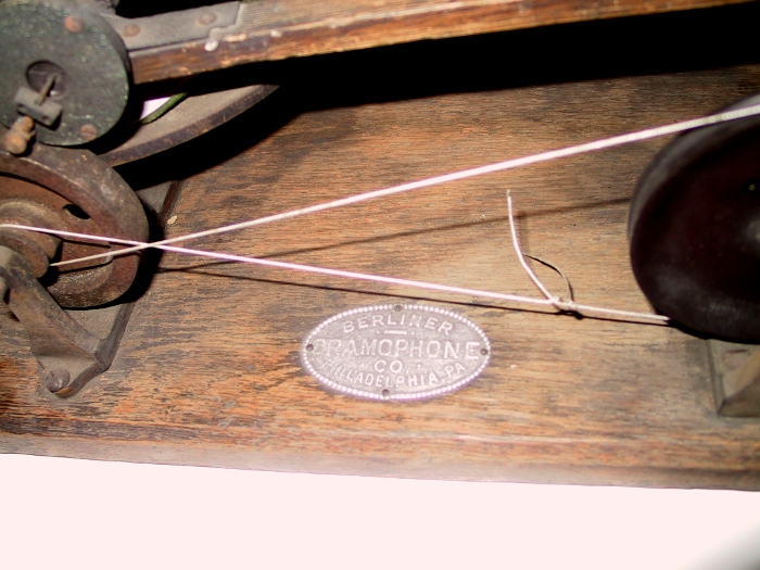 This string wind Berliner, first offered for sale in 1894, was the ancestor of all disc talking machines. It was difficult to regulate the speed with this hand crank arrangement, and the problem of a reliable spring motor was not solved until Berliner's association with Eldridge Johnson, culminating in the Improved Gramophone of 1898.