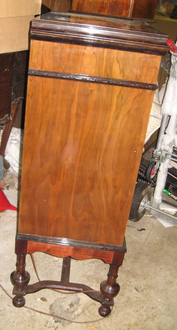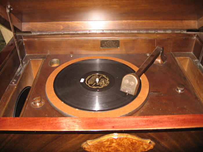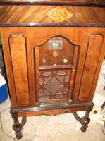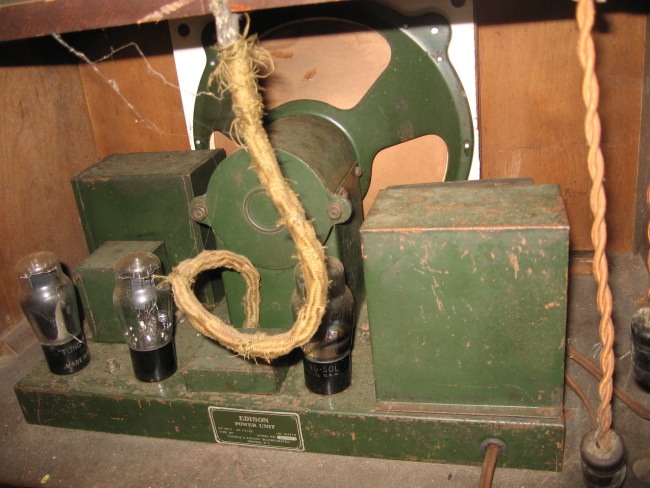 I don't rebuild electrical phonographs, only mechanical ones, but I will try to give an accurate description of the mechanics of this C4. The turntable rotates when it is turned on, but there is no sound from the speaker. The radio lights up when it is turned on, but there is no sound from the radio. It appears that someone started to restore this at some point, possibly putting in some new tubes. I have shot two images of the electrical components.