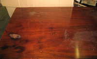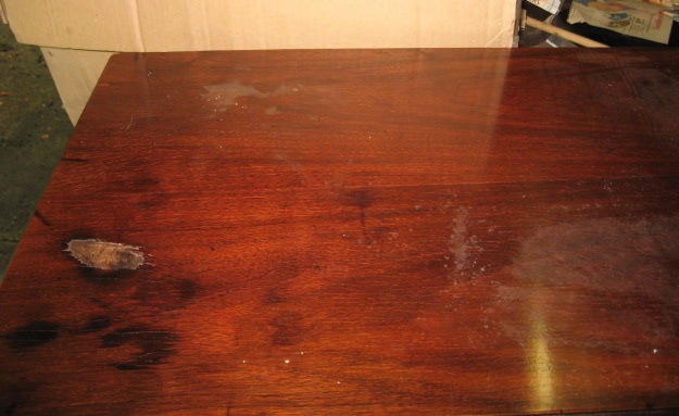 The cabinet has been refinished to a high gloss. There is a spot of veneer which has come off the lid (see image) and there is some minor veneer lifting on the front of the cabinet. The three buttons on the radio don't match, so I would assume that at least two are not original.