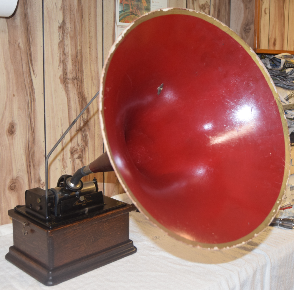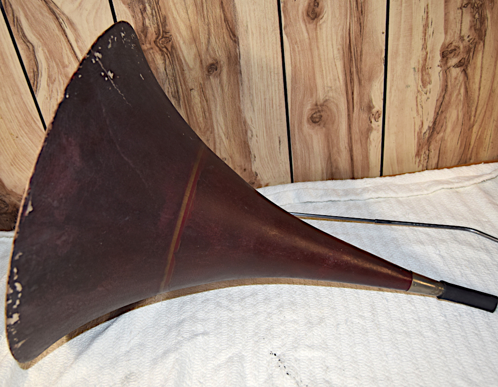 The Model A Fireside came standard with a baby red morning glory horn. The unusual red papier machine horn here, approximately 21 inches long with a 16 1/2 inch bell, would have been an aftermarket horn. It's in very nice original condition, with just some very light flaking on the outside, which highlights more strongly in the pictures than in real time. I can't tell you who made it, because I've never seen it before in over 50 years of collecting.