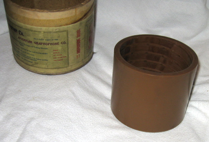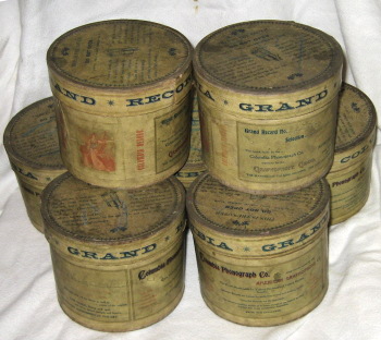 Seven 5" Columbia brown wax records in the original boxes. Columbia referred to these as "grand" records; Edison referred to them as "concert" records. These records are about as nice as they come -- I always hesitate to use the word mint, but this group of cylinders is really exceptionally nice and clean, with no mildew or cracks, as close to mint as you are likely to come. I don't have a working five inch machine to play these on, but most of the cylinders came with old little pieces of paper in the boxes giving the title. Of course there's no guarantee that the titles are correct, but these records look well taken care of and loved, and I'd guess that the titles are accurate. If you're still curious bring over your concert machine and we can play them. One of the records wasn't identified, and I can't make out the faded writing on the box.