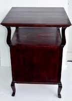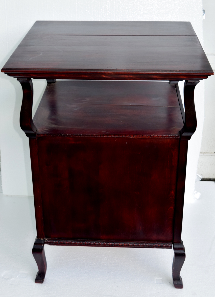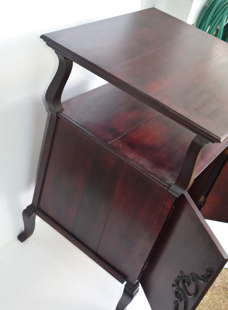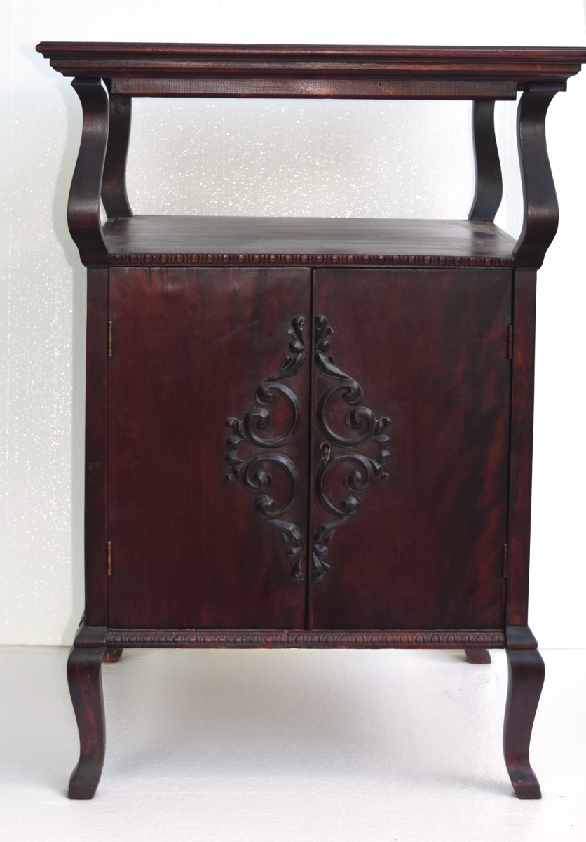 This double door mahogany base cabinet, which has been refinished, is a heavy and substantial cabinet, unlike the generic single door base cabinets usually found.