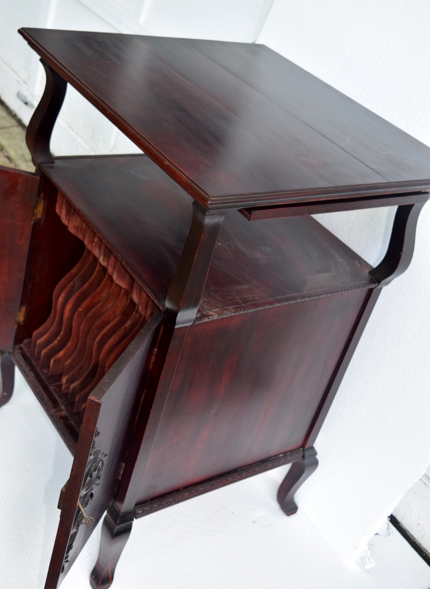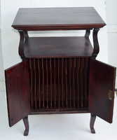 This original base cabinet is appropriate for Regina 15.5" music boxes, and for all other disc music boxes such as Polyphon, Symphonion or Mira taking a similar size disc. Dimensions are approximately 22" by 24" by 34" tall.