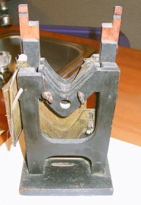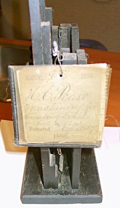 An official patent model released from the US patent office. The original tag reads reads " Machinery for Crimping Leather for Boots and Shoes " and was patented April 1880 by H.C. Pease.