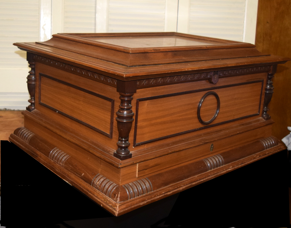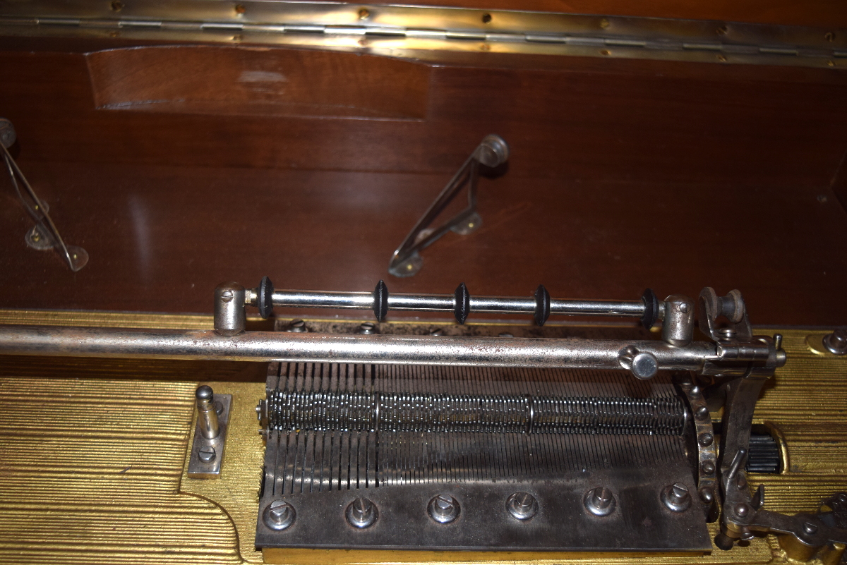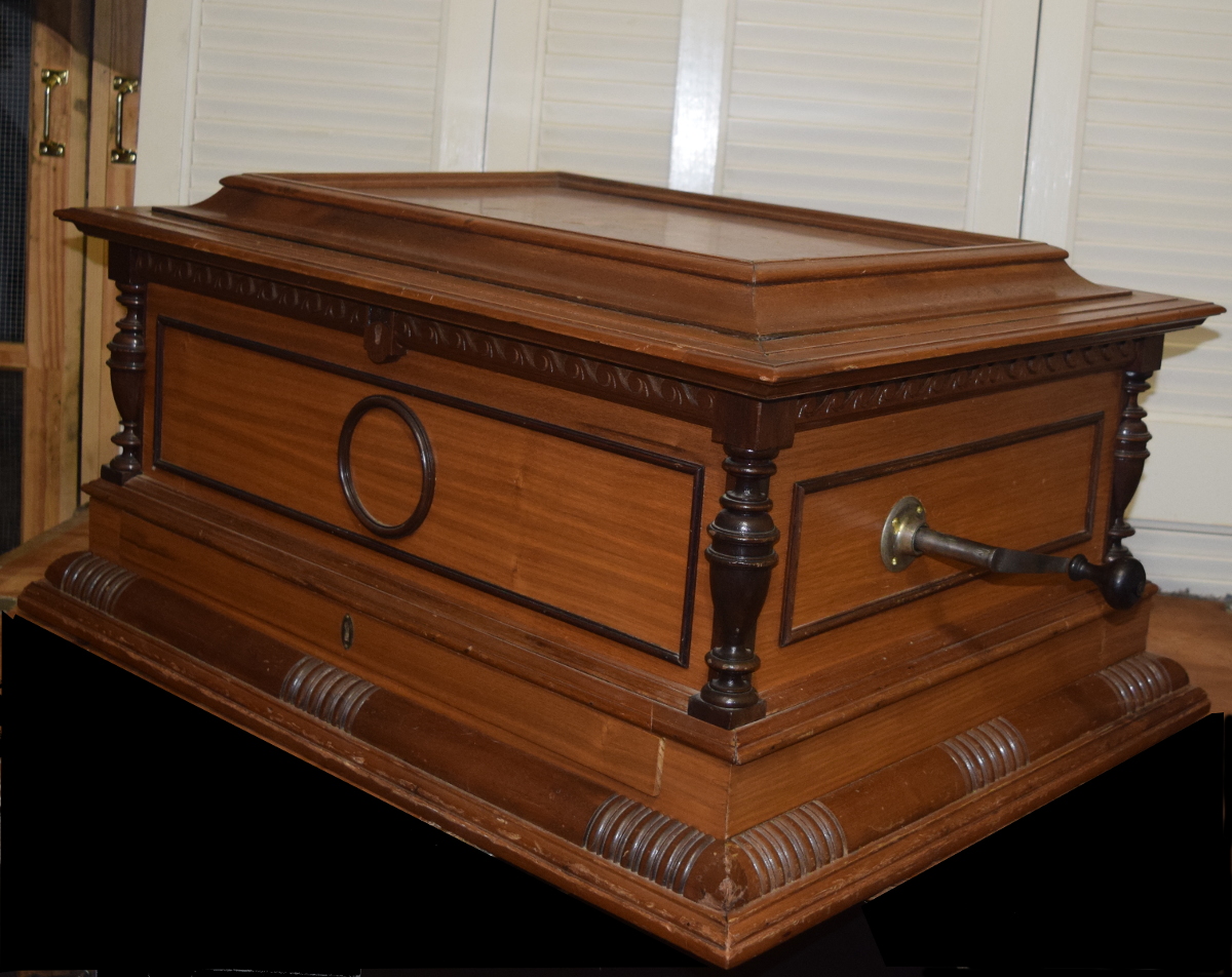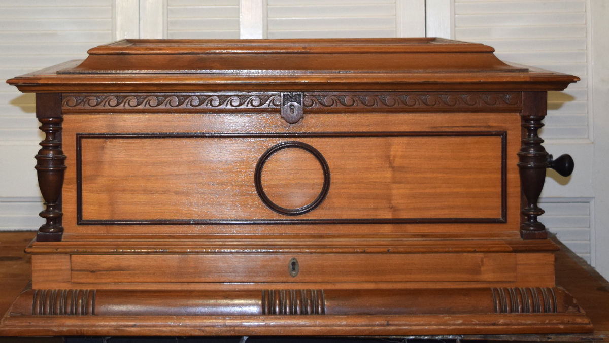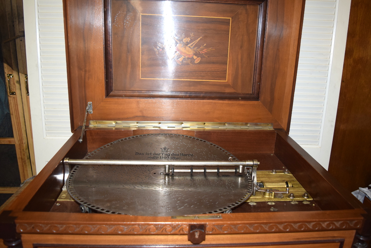 The large, substantial case, approximately 33" wide by 25" deep, is in very good condition and retains very nice original finish. The motor is working smoothly and properly, and I have adjusted the height of the idler wheels and the start-stop mechanism. There is some mild corrosion on the comb, primarily at the base of the comb where it is harmless. The machine plays properly and brilliantly, as you can hear in the mp3 file.