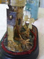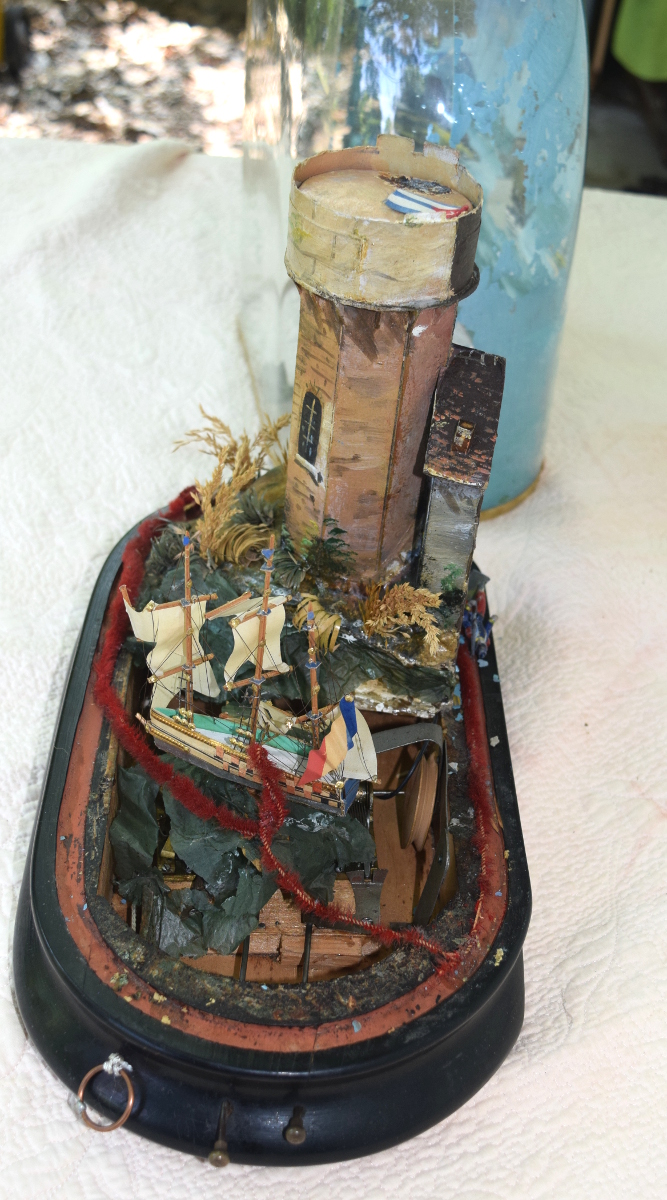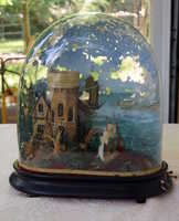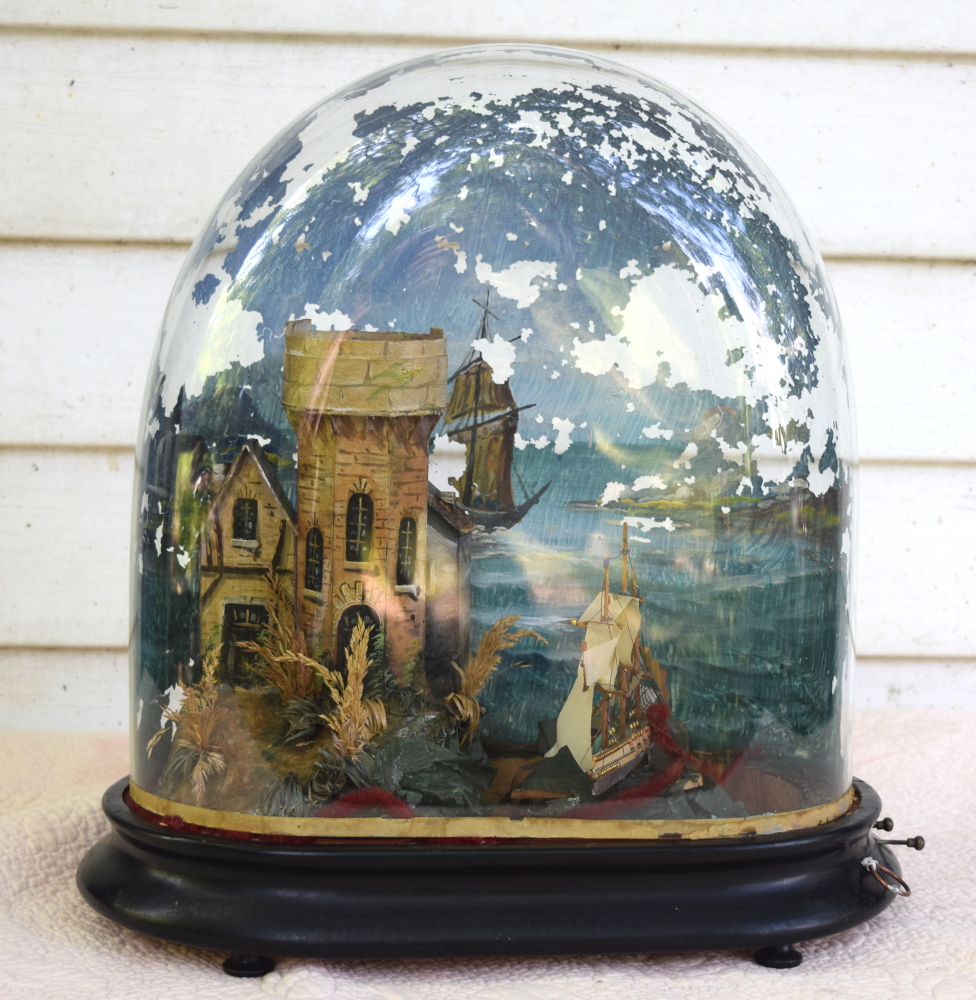 The movement looks complete but is presently not working. I haven't taken it apart and played with it, but it may be that it just needs restringing. Some elements such as the crepe paper sea will need to be filled in and reconstructed. The original dome has some typical flaking paint.