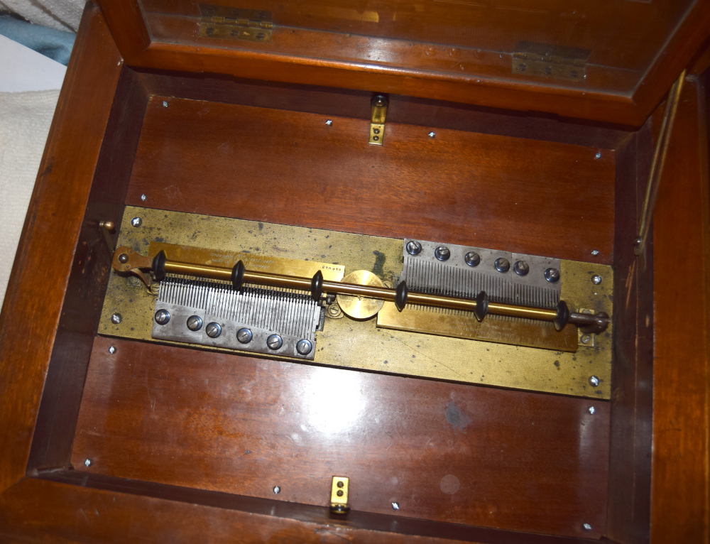 Some work has been done to the mechanism. The star wheel gantry has been cleaned. There was some typical oxidation of the leads as customarily seen on European machines; the leads were cleaned and sprayed with lacquer to protect them. The combs were removed and gently cleaned. The start/stop control was properly adjusted. Most important, a new mainspring was installed in the motor.